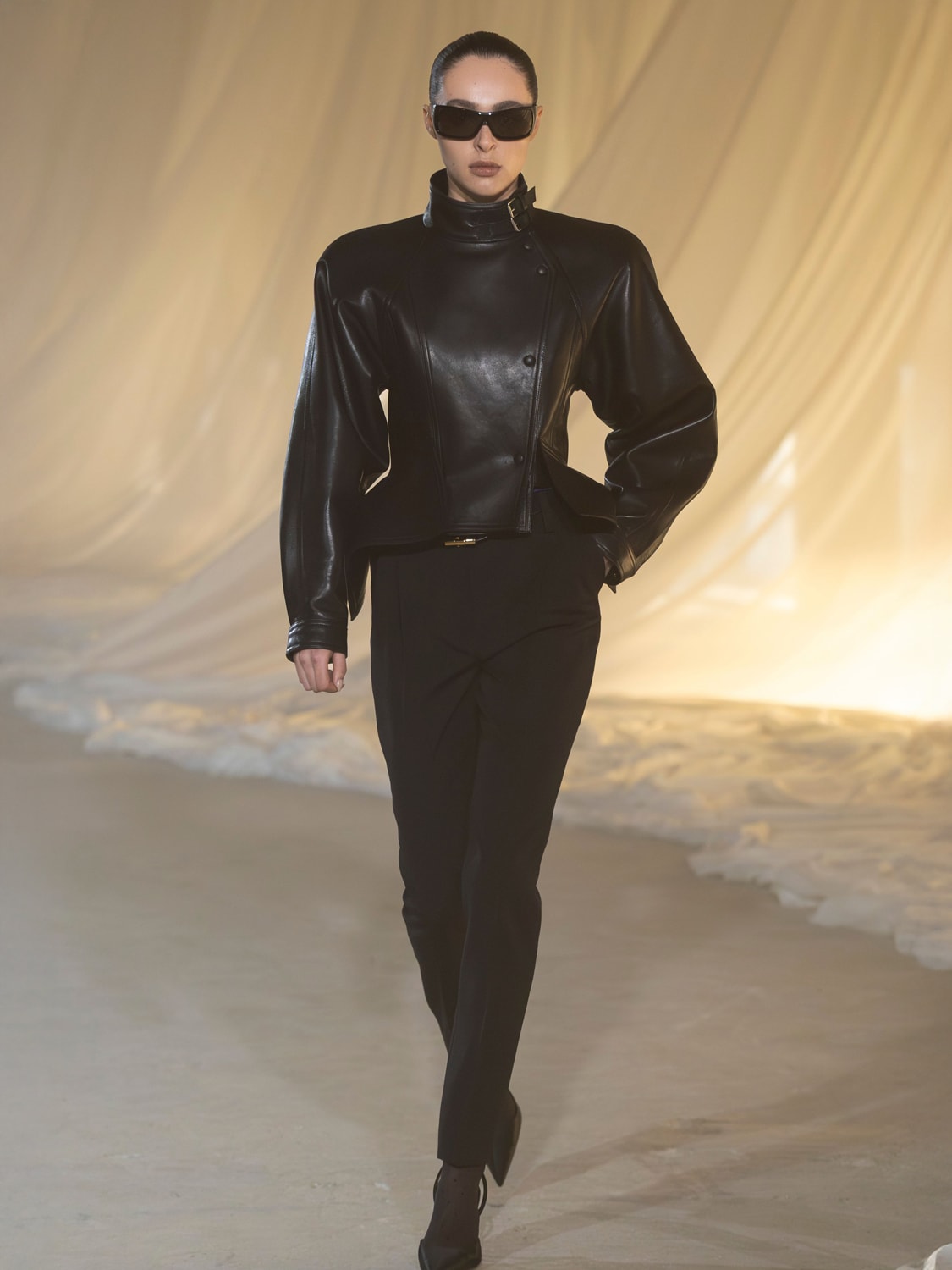 The collection unfolded in a darker, almost film-noir palette dominated by black leather, deep olive and metallic embellishments. Tron introduced techniques such as “liquid leather,” treated to move with the softness of fabric, alongside draped jersey dresses that traced the body. A revived peplum jacket, sculpted at the waist and flaring at the hip, emerged as a central silhouette.