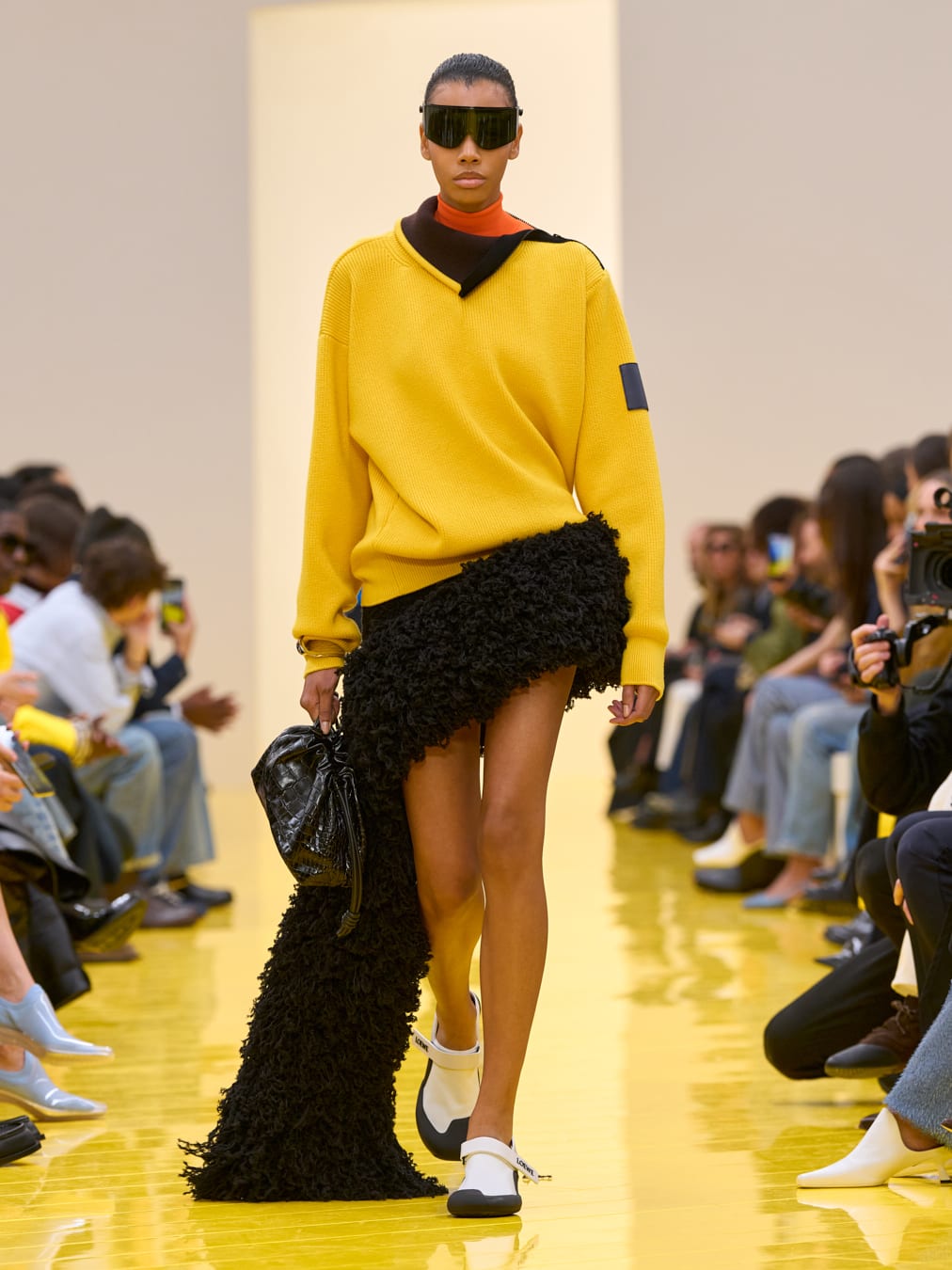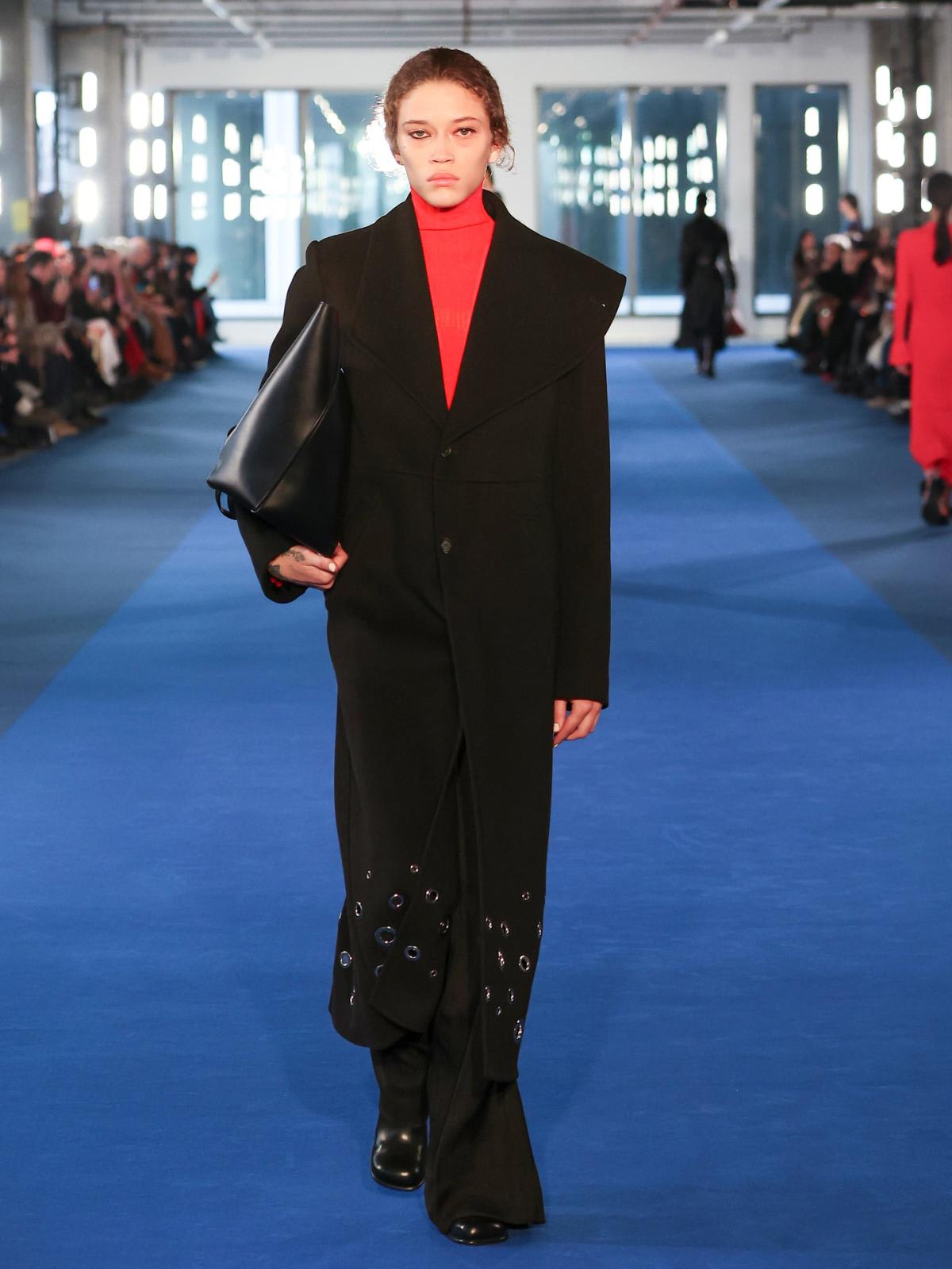 The collection centred on refined wardrobe staples, many rendered in a restrained palette of black and deep neutrals. Tailored coats, sharply cut suits and fluid trousers formed the backbone of the lineup, interspersed with a handful of fun pieces like a yellow leather jacket and fur-trimmed patterned vests.