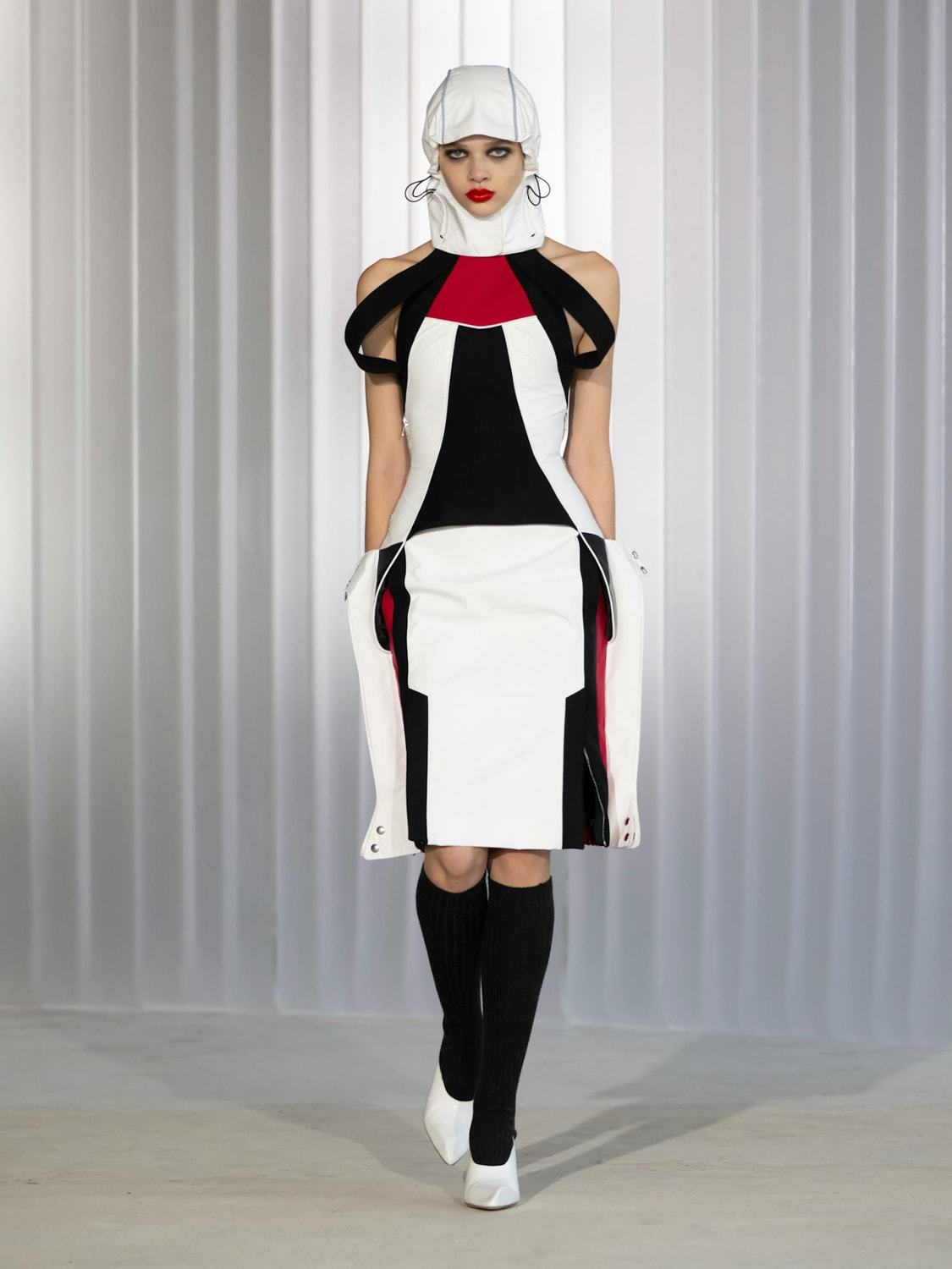 Their sophomore Fall 2026 collection pushed that sensibility further. Latex-coated dresses, parkas with inflatable pockets and oversized shearling coats appeared alongside stringy dresses that swung with movement. Bold colours injected a pop-art energy into the lineup.