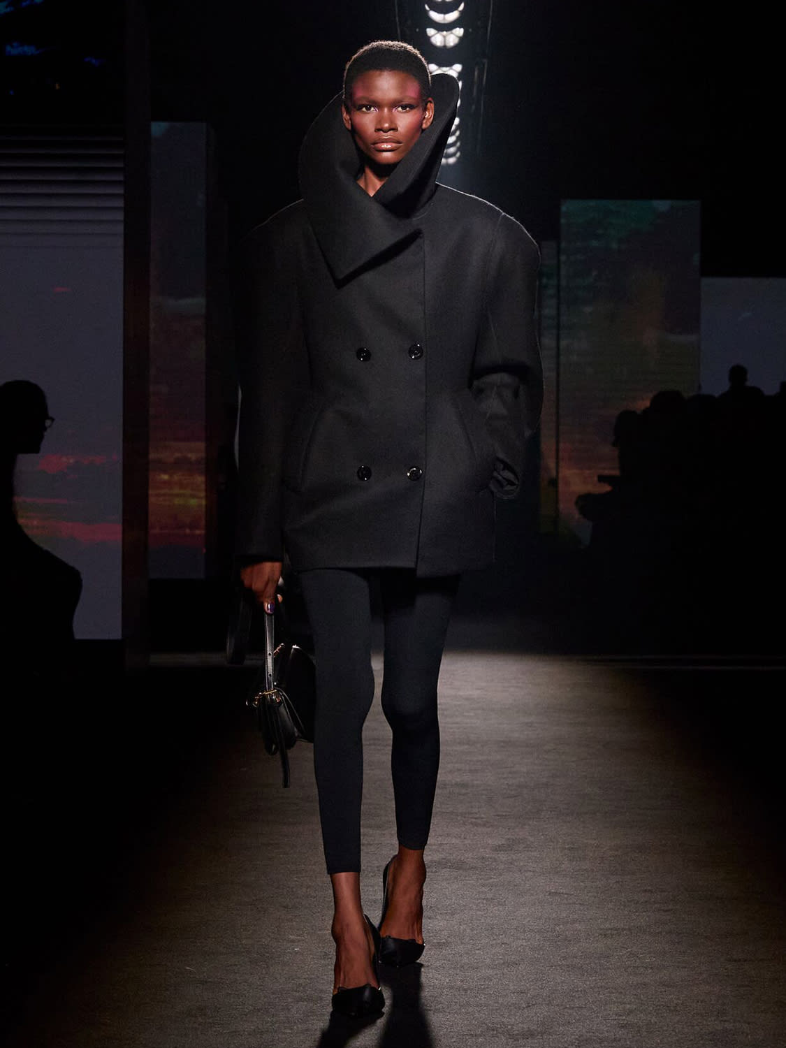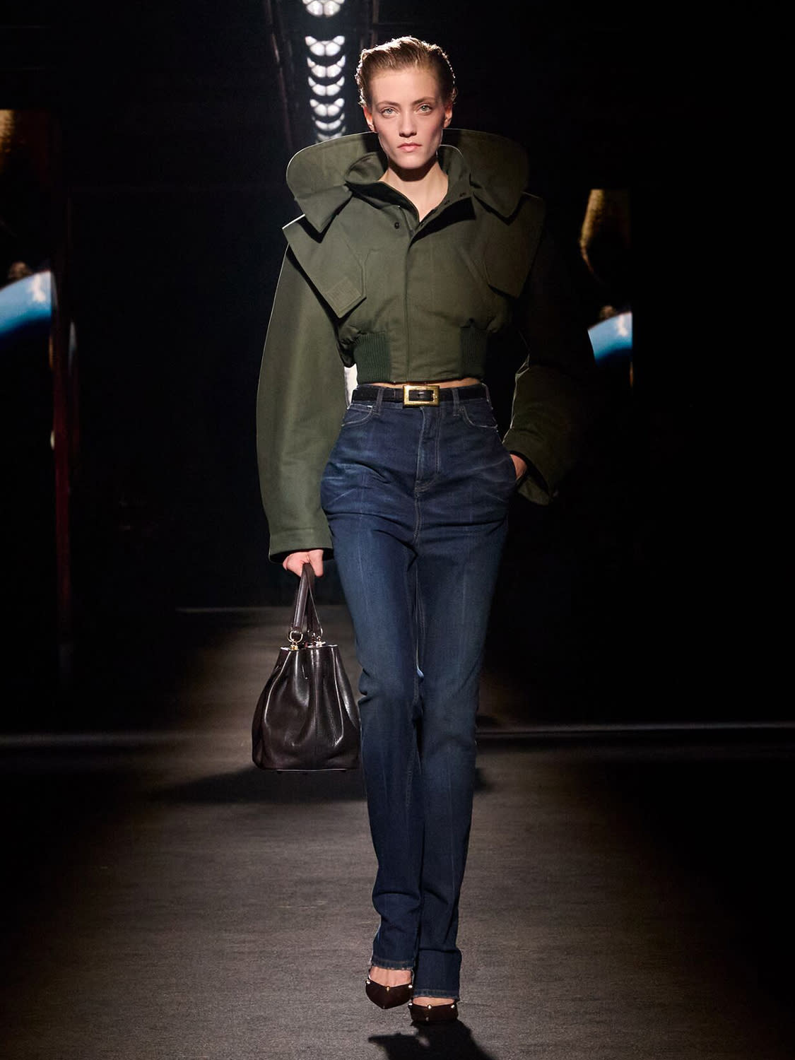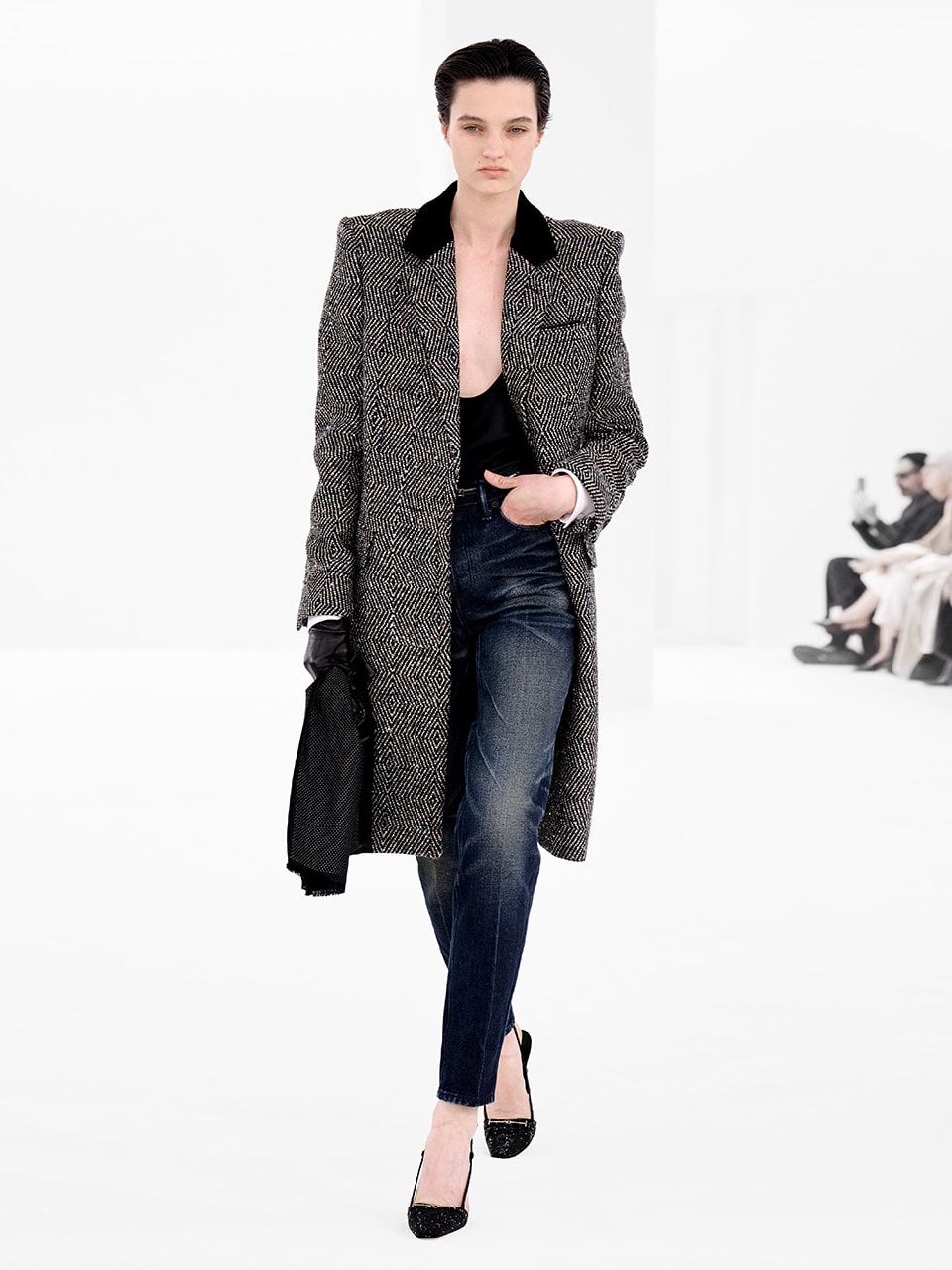 A sculptural peacoat with a face-framing collar nodded to the architectural tailoring of founder Cristobal Balenciaga, while sportswear and denim kept the wardrobe contemporary. Opera gloves and delicate pointed heels finished otherwise casual looks, sharpening the contrast between formality and ease. This push-and-pull between couture polish and everyday dressing is beginning to define this new Balenciaga.
