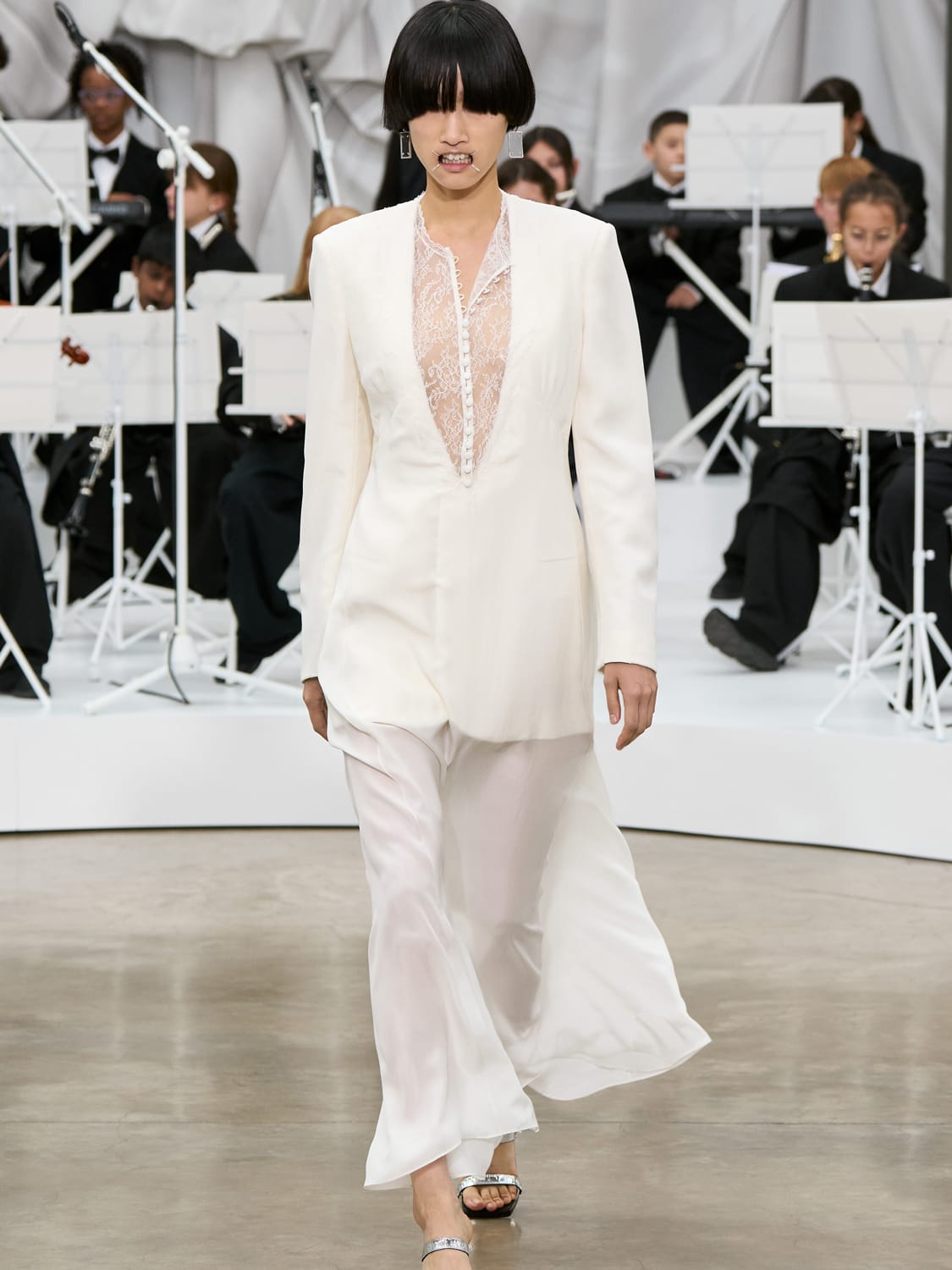 Elsewhere, Anderson’s instinct for ease and tactility came through in coats that wrapped like dressing gowns, and lace dresses trimmed with raffia florals. The effect loosens Dior’s historic structure, trading strict architecture for movement and intimacy.