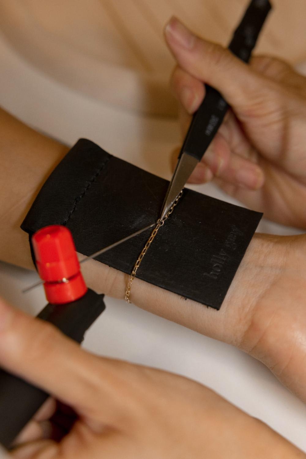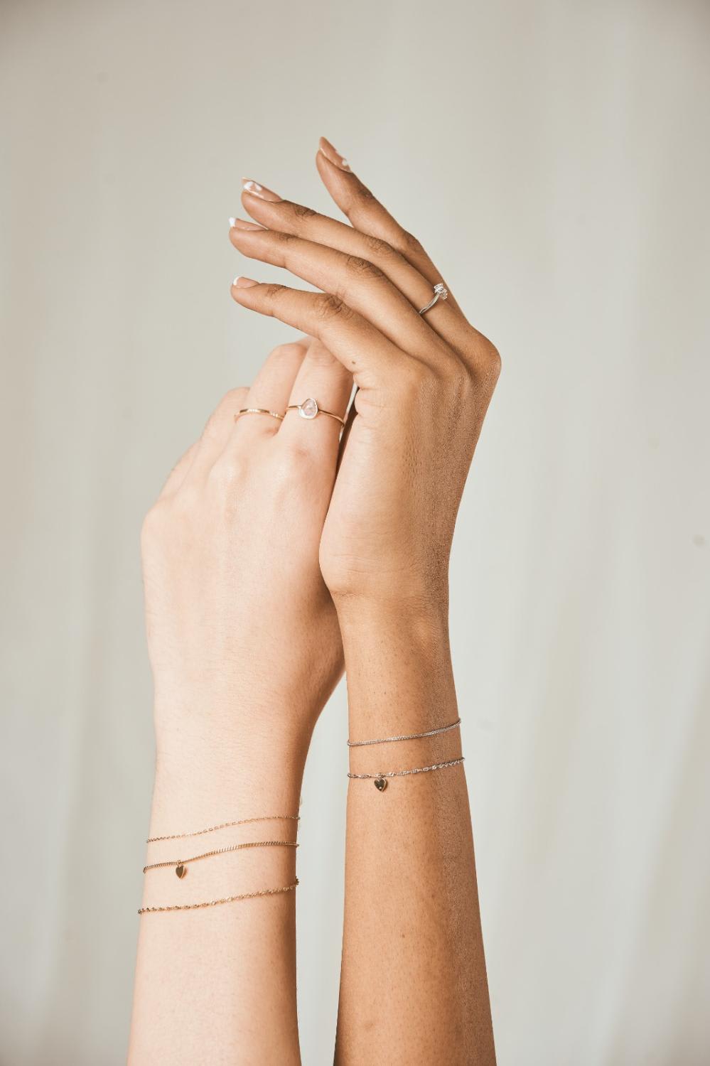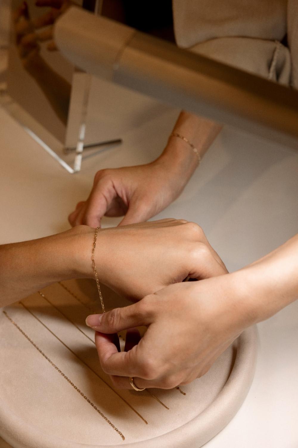 Only 14K solid gold chains are used for permanent bracelets at both Curious Creatures and Holly Gray, because the material is hypoallergenic. It’s safe to wear for those with sensitive skin, except people who are allergic specifically to gold. Solid gold is also more durable than gold-plated metals, which means it’s “shower-proof” and do not react as easily to lotions or perfume, although it is recommended that direct contact with these substances be avoided as far as possible.