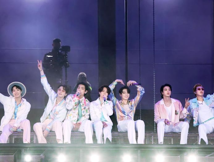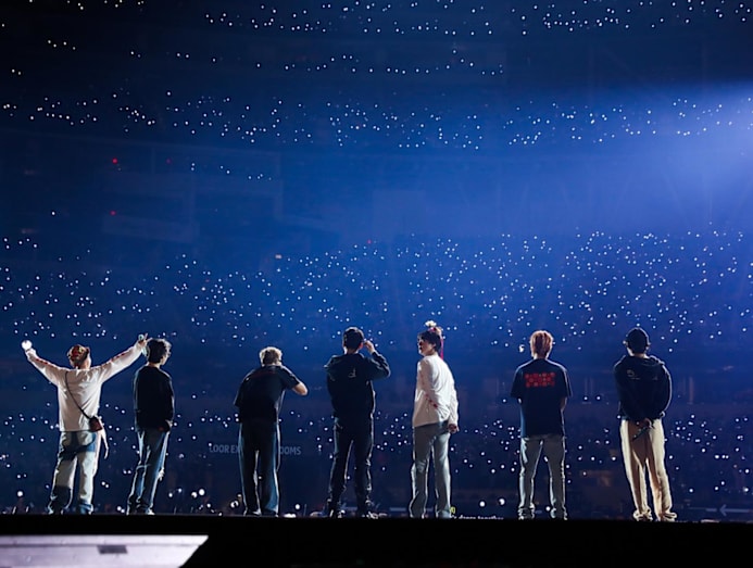 K-pop group BTS surrounded by ARMYs at the finale of the BTS World Tour Love Yourself: Speak Yourself tour in 2019. (Photo: Weverse)