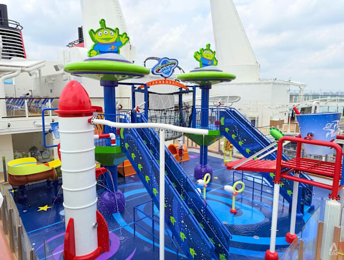 On the top deck, there is also the Toy Story Splash Zone designed for toddlers and young children. The colourful play area includes water features and the Slide-a-saurus Rex family slide, where kids can splash around and cool off while parents relax nearby.