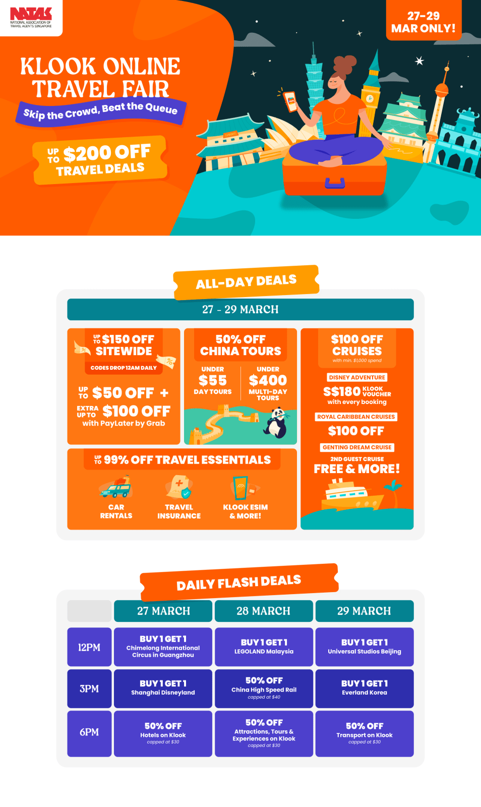 Online booking platform Klook will be holding a 72-hour online travel fair from Mar 27 to 29. The online event will run alongside the 63rd NATAS Travel Fair at Singapore Expo and offer an alternative for travellers who prefer to browse deals without attending the physical fair.