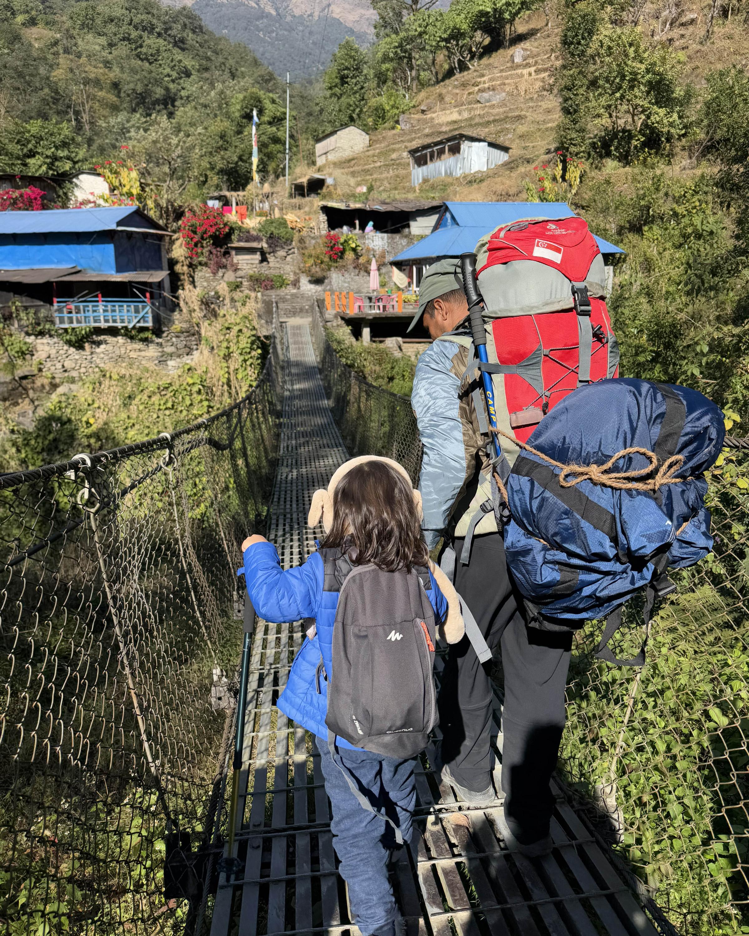 On the trek, the porters played with our children and guided them across rope bridges. We played Floor is Lava, the girls skipping over real-life obstacles of puddles and overflowing streams. Llucia proved to be a hardy climber-in-training, walking with us when she could have been on the pony, sometimes running with the porters.