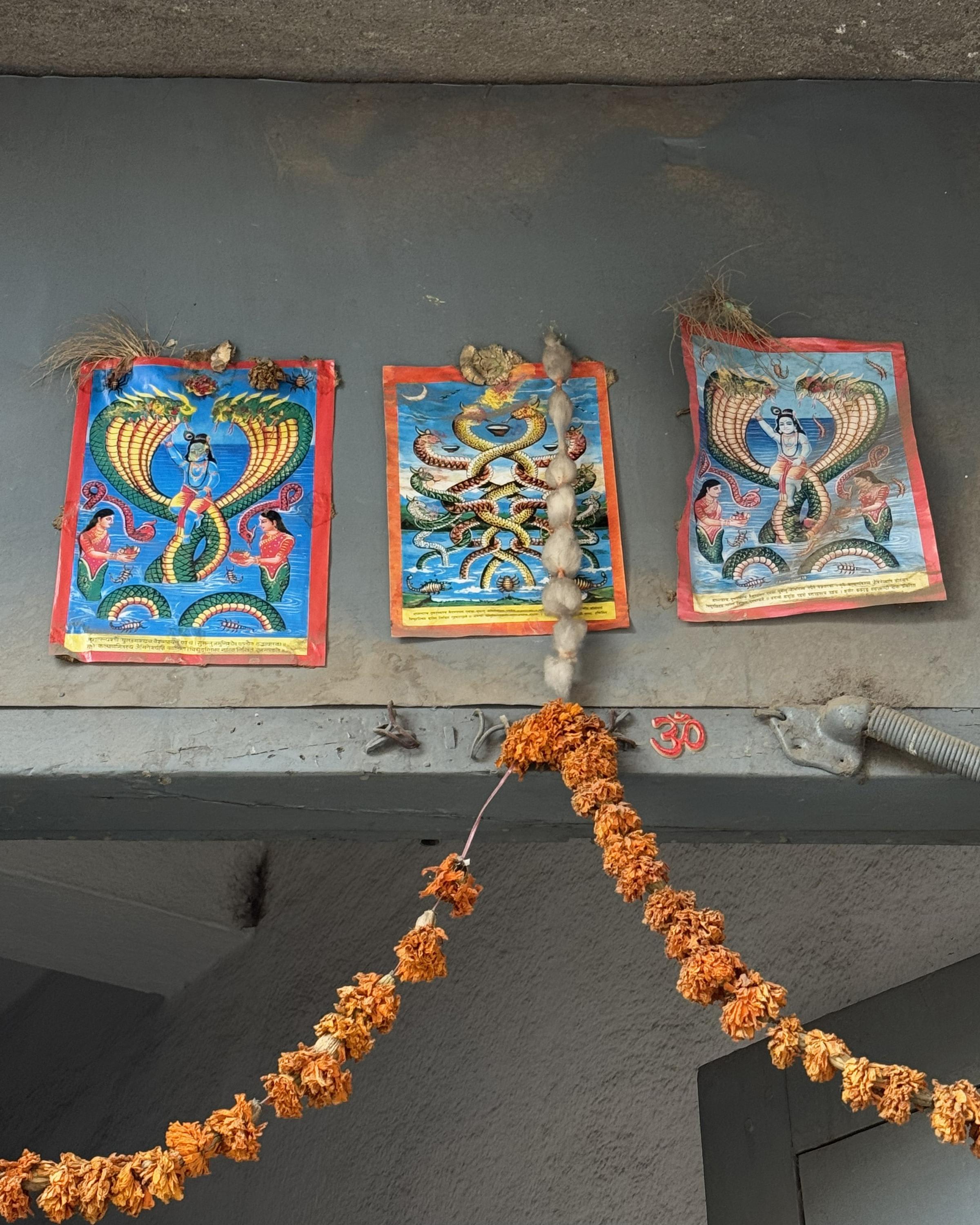 We paused every so often in the streets, the girls spotting five-headed snake statues, serpent details on fountain carvings, and Nag Panchami posters above doorways. An added bonus: Hunting down French street artist Invader’s mosaic artworks in downtown Kathmandu.