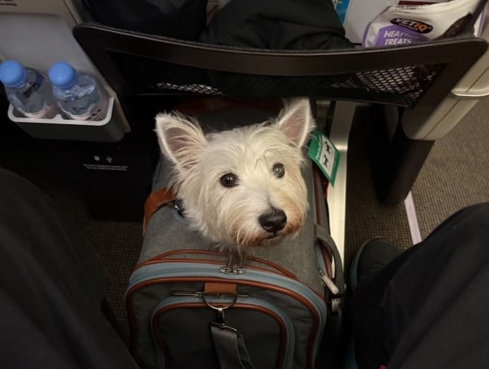 Seasoned travellers like Snuffles, who has been flying since he was eight weeks old, tend to settle in quickly once on board. But for first-timers, it can take a little patience and TLC. Despite Liang’s best efforts to tire Happie out during the day in hopes she’d snooze through the flight, the little terrier was anxious during take-off. Poof, too, let out a bark or two before calming down.