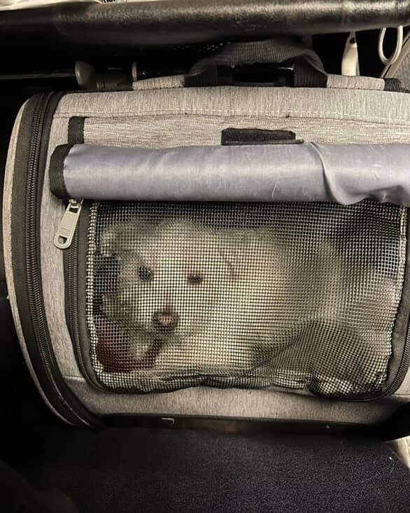 “We started with placing Poof in the zipped pet porter for short durations. For the month before the trip, she slept in it every night.”