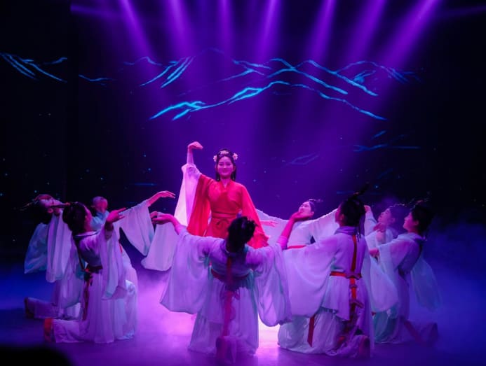It begins with Buddha sitting in a lotus flower, before eventually rising upwards and revolving 360 degrees. The nine dragons around the pool spray water skyward to bathe the baby Buddha with water.