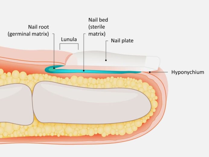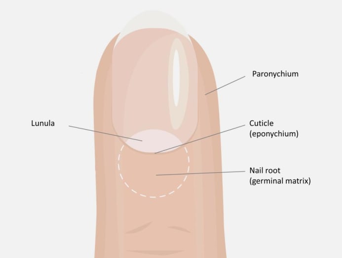 Nail root: Also known as the germinal matrix, this is the nail factory. You might see a glimpse of it as a white, crescent shape found at the base of the nail known as the lunula, but it actually extends several millimetres into the finger.