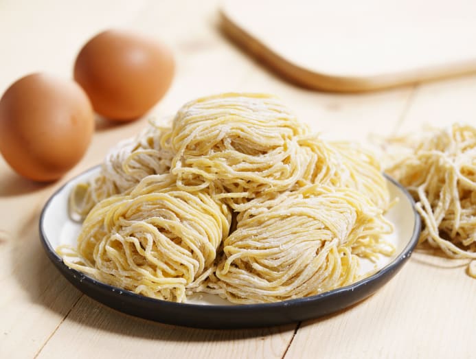 Generally, noodles with a yellowish hue contain eggs, such as pasta (eggs and durum wheat flour) as well as ban mian, mee hoon kueh, mee pok and mee kia, which are made with varying ratios of wheat flour and eggs.
