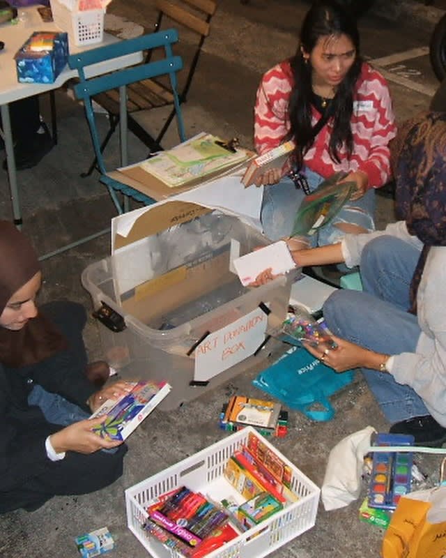 At these sessions, similar to the charity festival, Iffah and her friends would bring boxes filled with art materials, lay down cardboard or large sheets of paper, and put up a sign that read “MAKE ART 4 FREE”, alongside other signs explaining what the initiative was about.