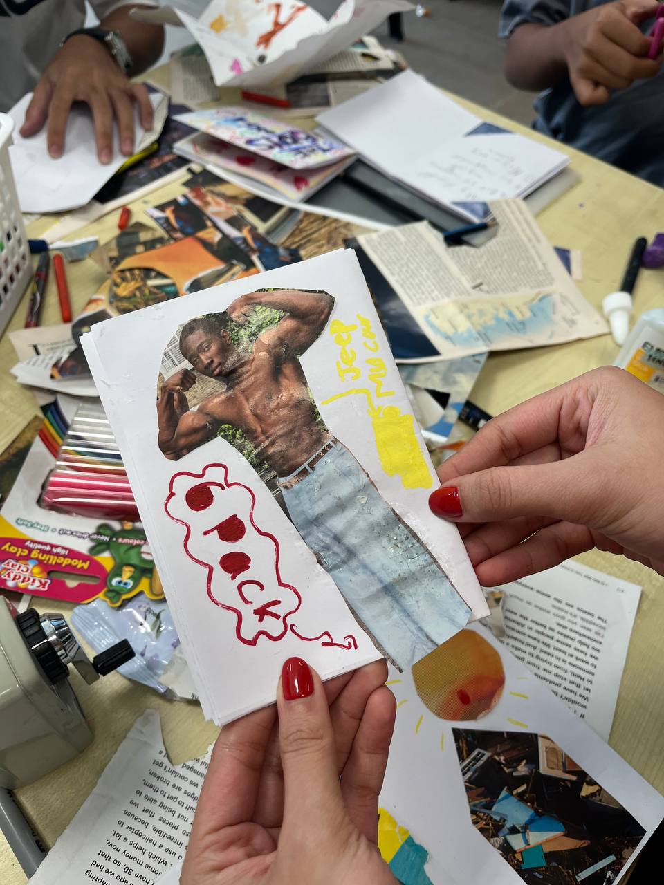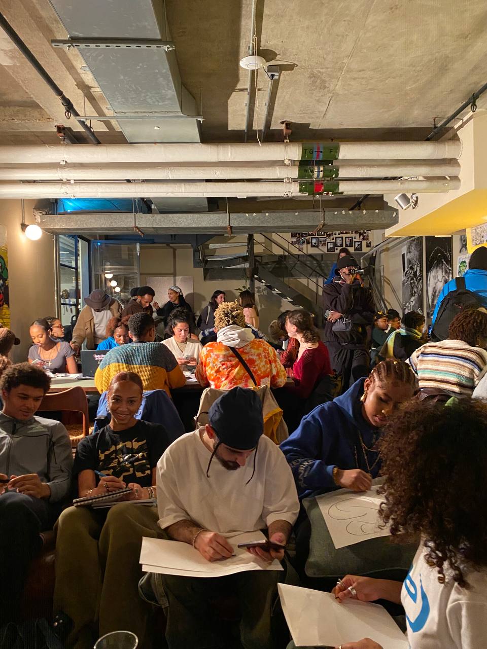 People were lying down, sitting on the floor, or standing by the walls. Everyone was creating something – from drawing slanted flowers with broken crayons to mixing clips on their phones to make a spontaneous reel.