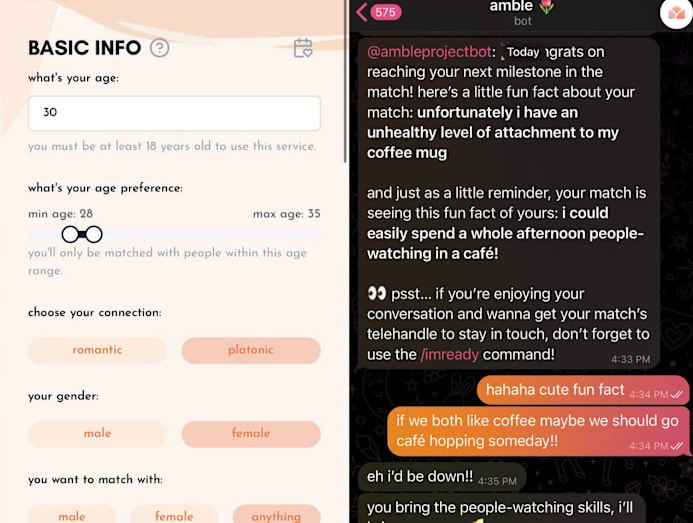 According to Amble co-founder Alyssa Chua, users first fill out a series of long-form questions about their personality, interests and values. From there, Amble uses artificial intelligence to match users based on commonalities. Users can also indicate their intentions for forming connections on the platform, be it friendships, relationships or both.